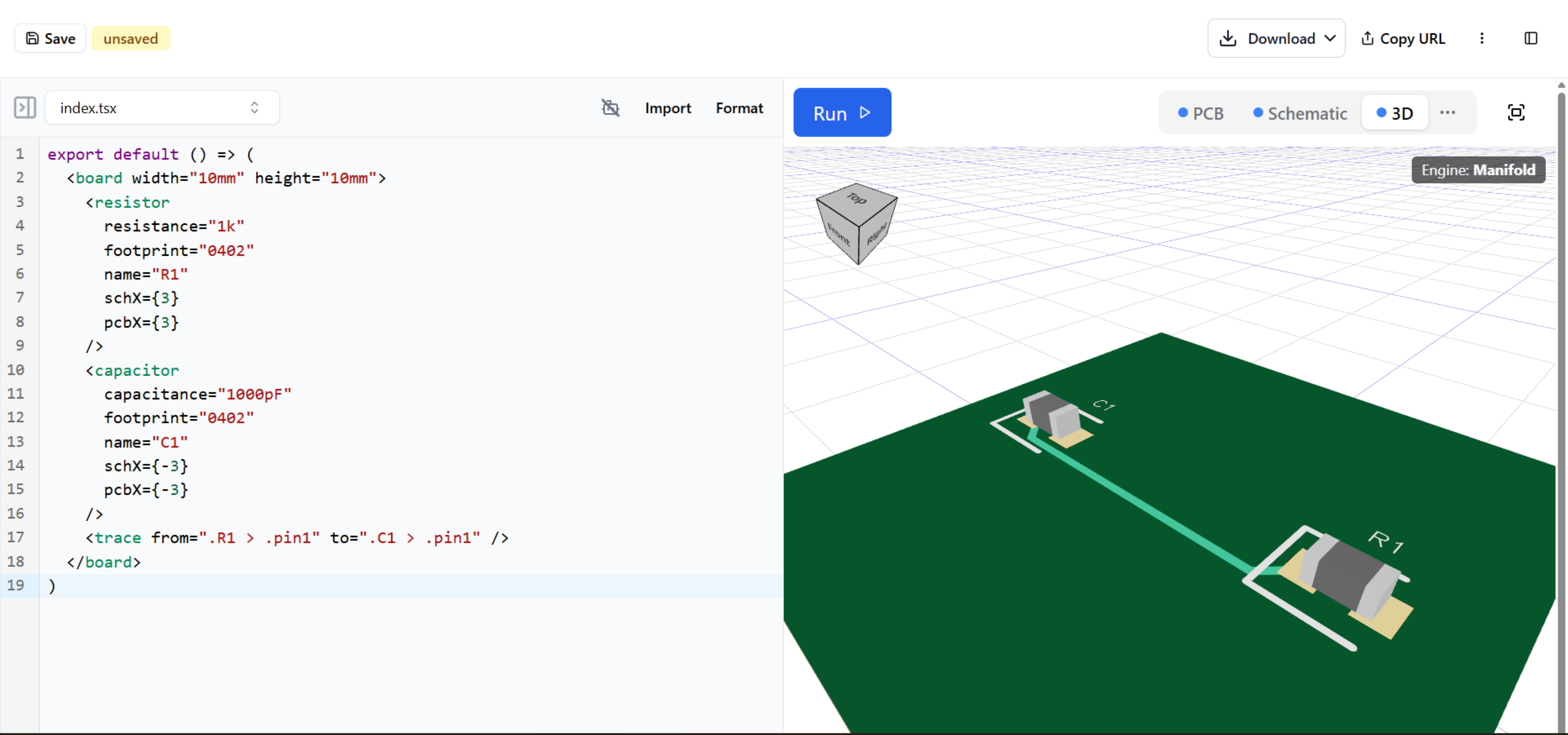 After you make a change, click the "Run" button to see your changes applied. You can use the PCB, Schematic, and 3D views to make sure everything is correctly aligned.